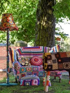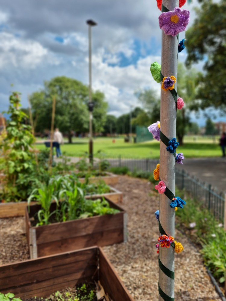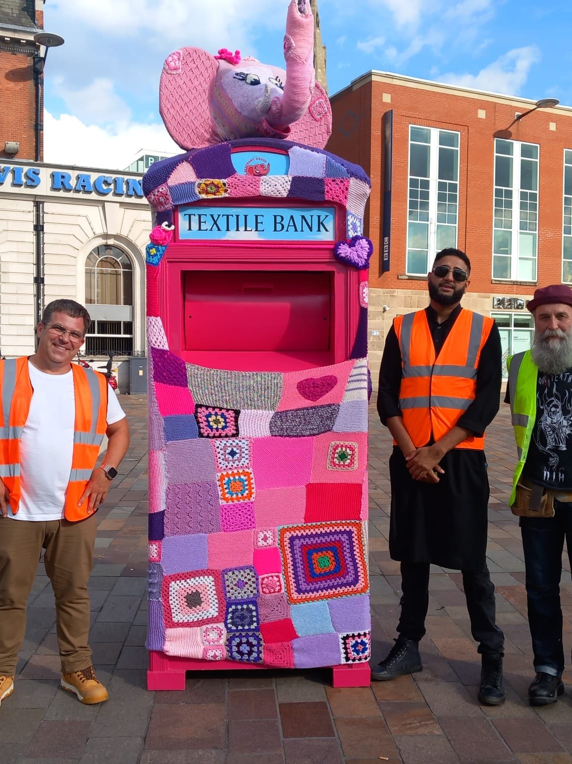 Community Projects City Quilt Highcross Window Installation by Cosby Crafters Belgrave Community Garden Yarn Bomb Pink Elephant Textile Bank